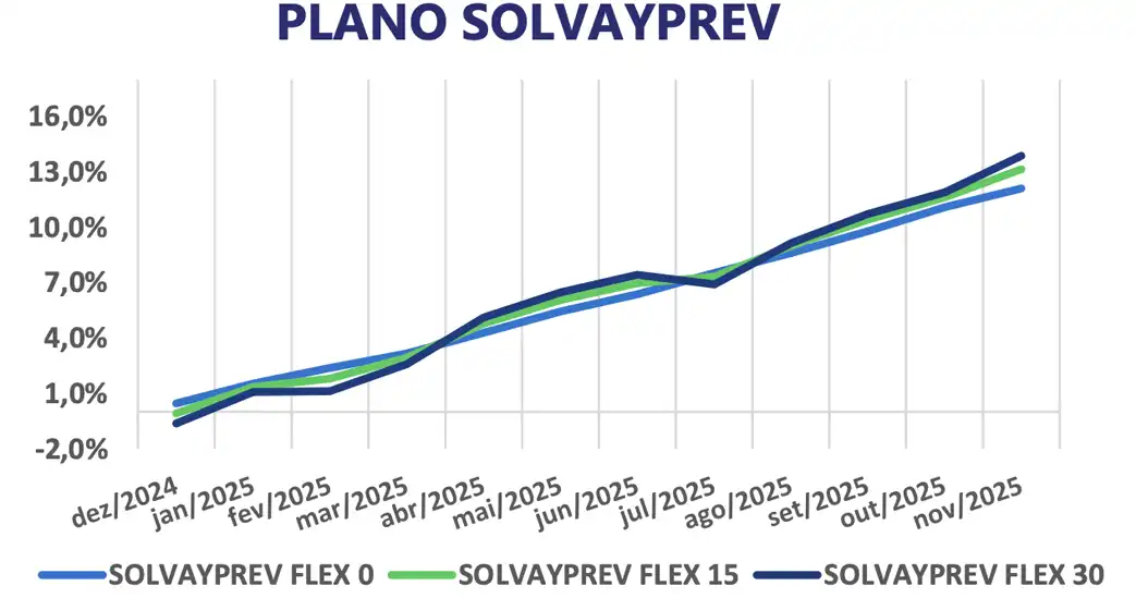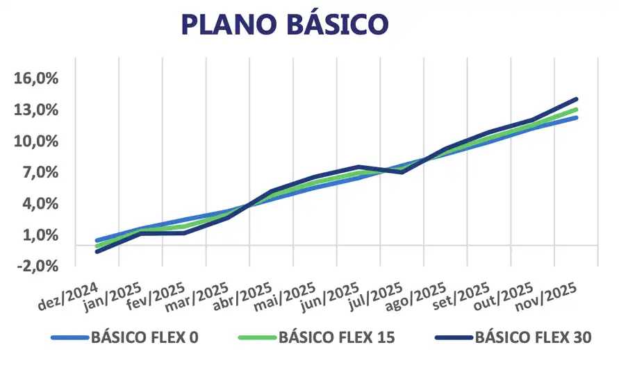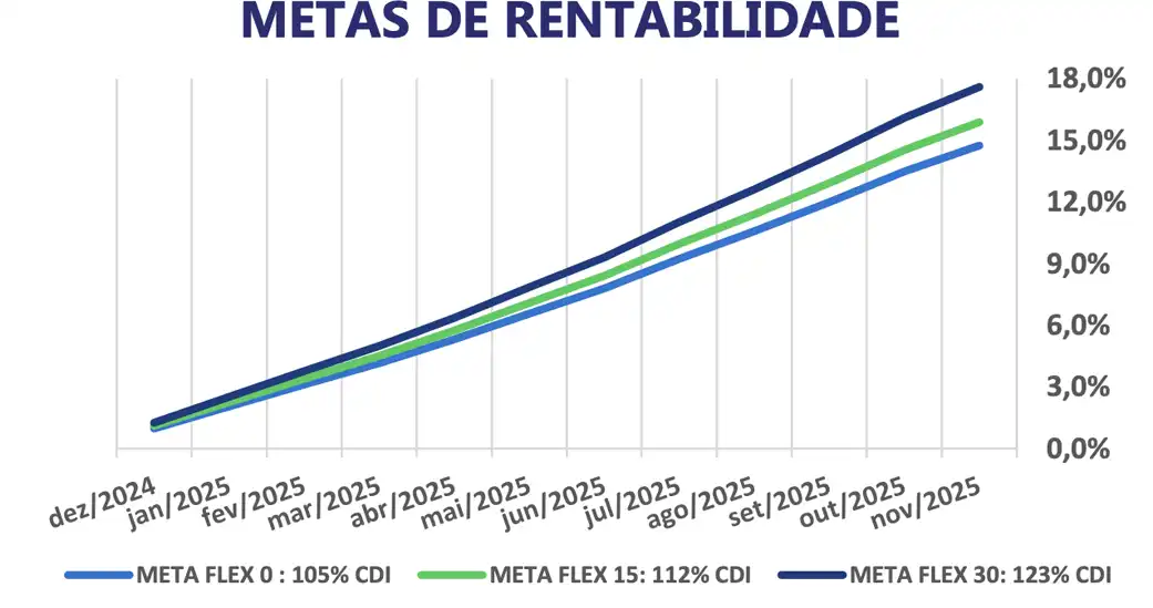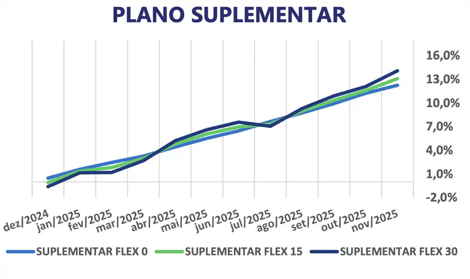 Em novembro, todos os perfis apresentaram retornos positivos. Os perfis Flex 15 e Flex 30 performaram acima das suas respectivas metas de retorno, enquanto o perfil Flex 0 ficou abaixo do benchmark. Os perfis mais propensos a risco foram beneficiados pelo desempenho da Renda Variável. Já os perfis com menor propensão a risco, por não apresentarem alocação em renda variável, foram mais impactados com o baixo desempenho dos fundos VINCI PRHOSPER e VINCI VALOREM no mês.